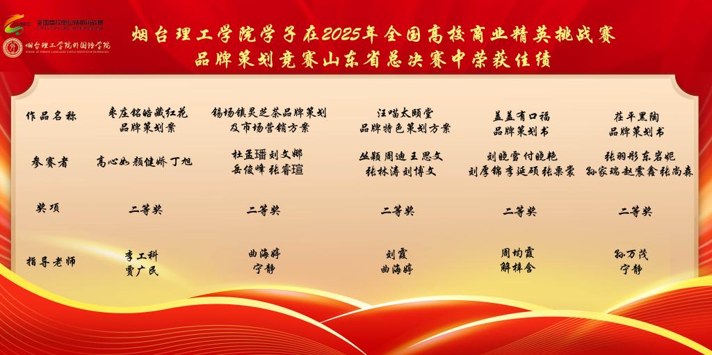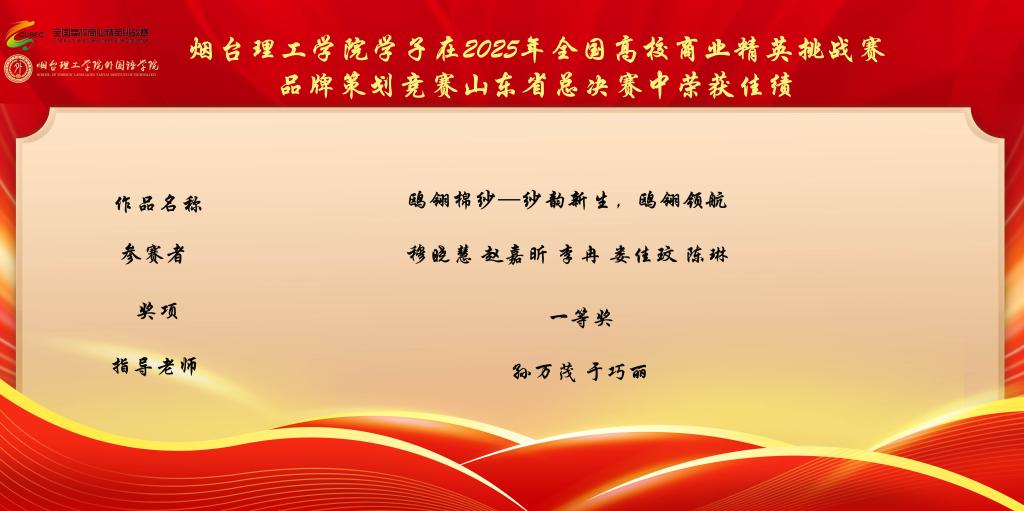 近日,2025年全国高校商业精英挑战赛品牌策划大赛山东省总决赛圆满落幕。太阳成集团tyc234cc学子在本次大赛中表现突出,在68所高校、826支队伍的激烈角逐中,斩获一等奖1项、二等奖5项、三等奖1项,充分彰显了公司数智型外语人才培养的丰硕成果。其中,获得省一的参赛作品《鸥翎棉纱—纱韵新生,鸥翎领航》品牌策划书(参赛选手:穆晓慧、赵嘉昕、李冉、娄佳玟、陈琳;指导教师:孙万茂、于巧丽)顺利进入国赛!