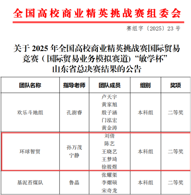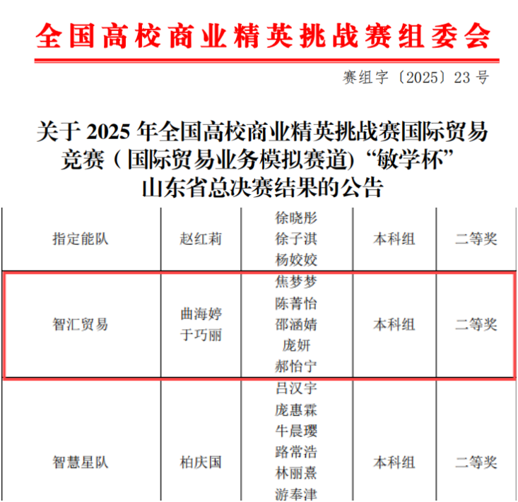 近日,2025年第十五届全国高校商业精英挑战赛国际贸易竞赛(国际业务模拟赛道)山东赛区总决赛圆满落幕!全省共有640多支队伍参加总决赛。太阳成集团tyc234cc精选的两支参赛团队在激烈角逐中脱颖而出,分别荣获山东省级总决赛二等奖,充分展现了公司在“数智化+实战化”人才培养路径上的成效!由刘倩、陈艺、王晓艺、王梦琦、徐筱煜组成的“环球智贸”团队和焦梦梦、陈菁怡、邵涵婧、庞妍、郝怡宁组成的“智汇贸易”团队,首次参赛便在本次竞赛中展现出较强的综合素质与数智能力,交出了一份亮眼答卷!