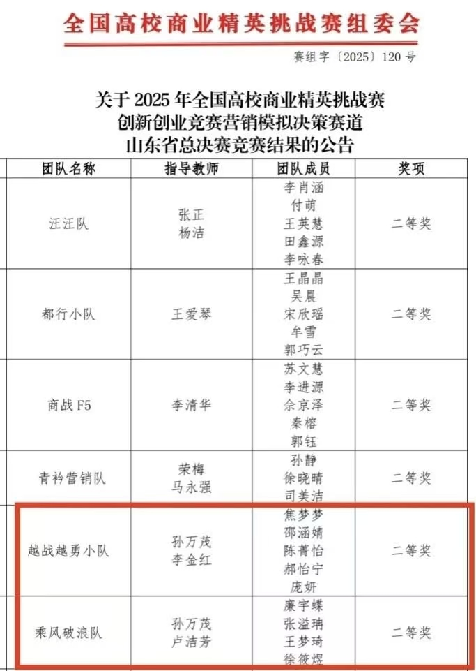 喜报|太阳成集团tyc234cc学子在2025年全国高校商业精英挑战赛创新创业竞赛山东省总决赛中再获佳绩!