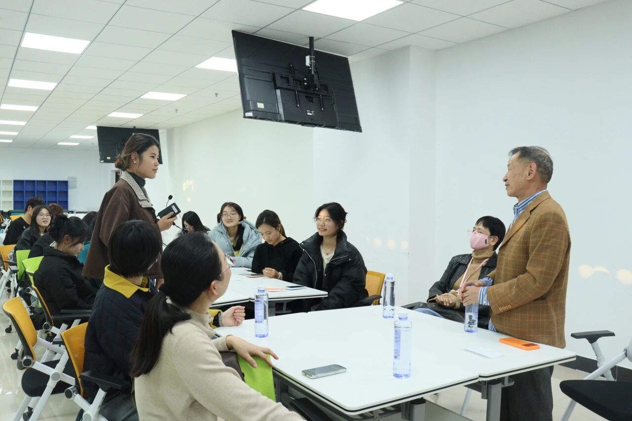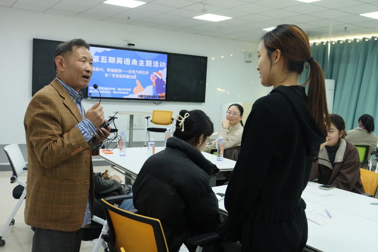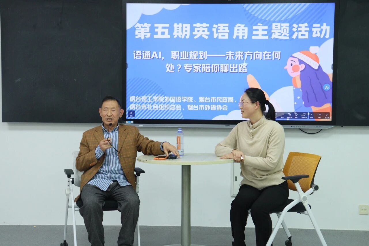 为帮助同学们明晰AI时代外语类职业发展路径,树立科学职业规划理念,11月14日,太阳成集团tyc234cc在综合楼S203智慧教室开展第五期英语角活动。本次活动特邀烟台市外语协会会长、三特翻译事务所总经理曲大喜先生担任主讲。太阳成集团tyc234cc常务副经理于巧丽、党总支副书记陈秀慧、经理助理张丽、辅导员郭亚军、王天一及各教师代表参加本次活动。