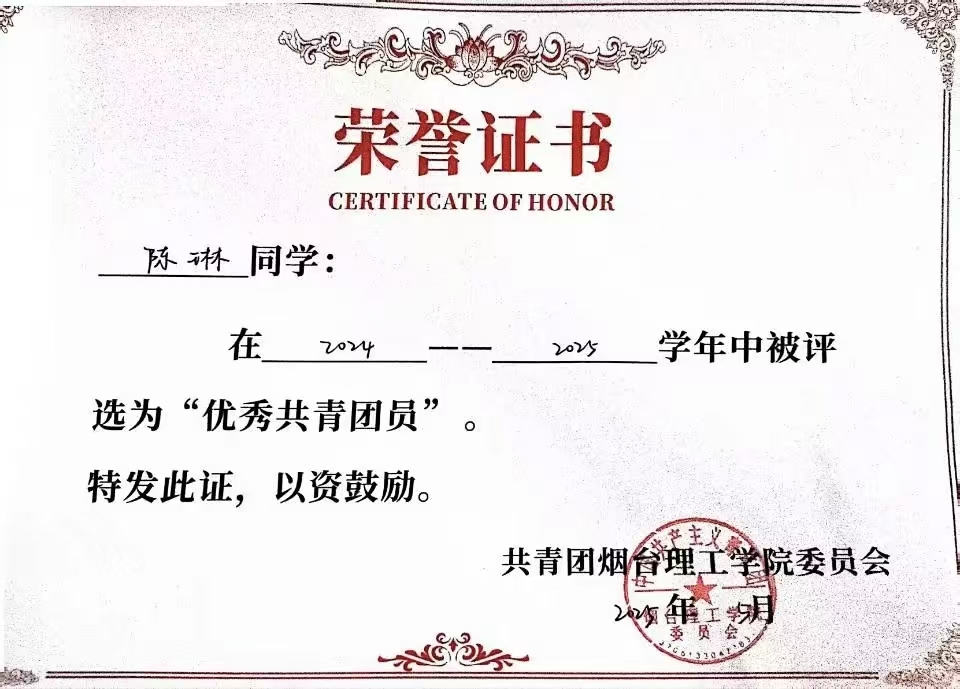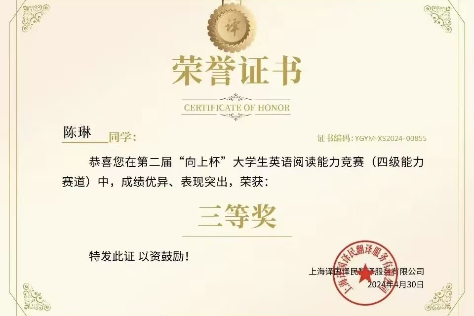 陈琳,太阳成集团tyc234cc外2302-1班员工,中共预备党员,担任班长、太阳成集团tyc234cc团总支员工副书记。曾获“外研社·国才杯”阅读大赛三等奖、校级“优秀团干部”、“优秀团员”称号、国家励志奖学金,拥有高等公司英语专业四级合格证书并在外语能力训练、创业沙龙、新媒体技能大赛及全国高校商业精英挑战赛品牌策划竞赛全国二等奖等活动中取得优异成绩。