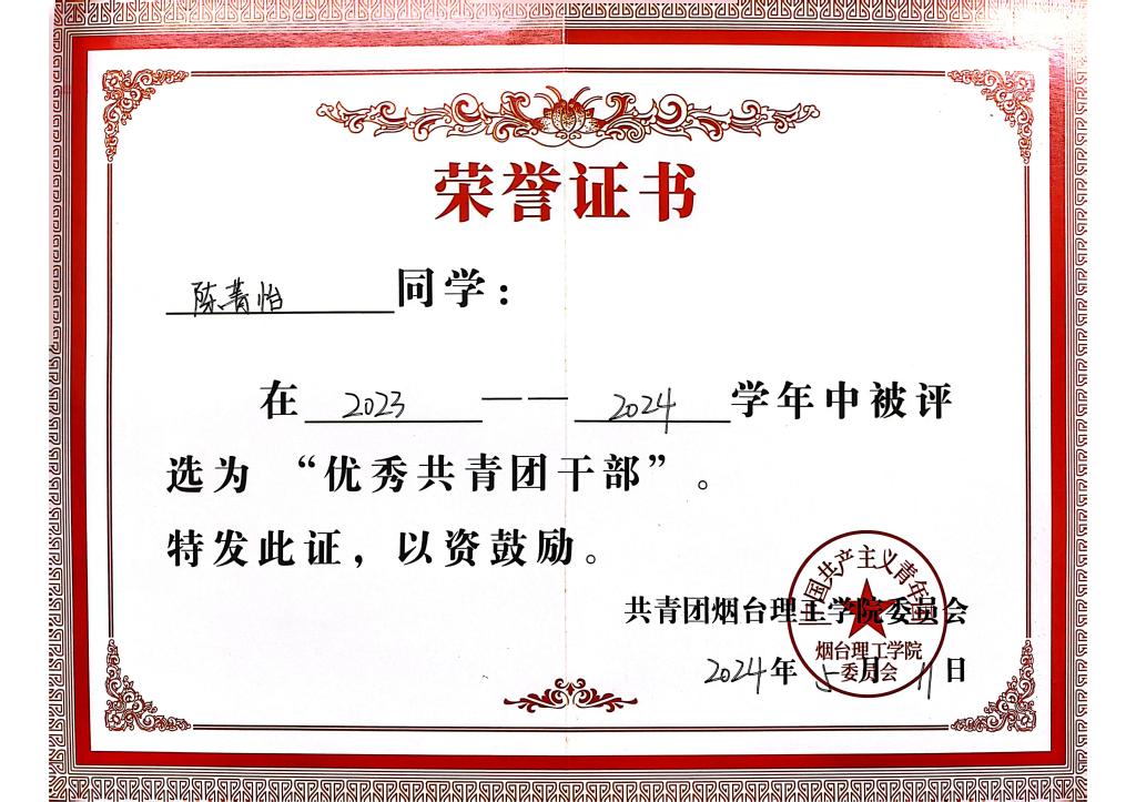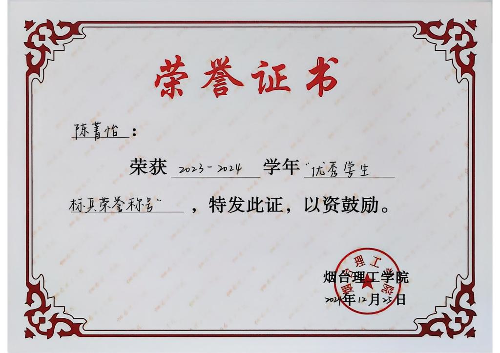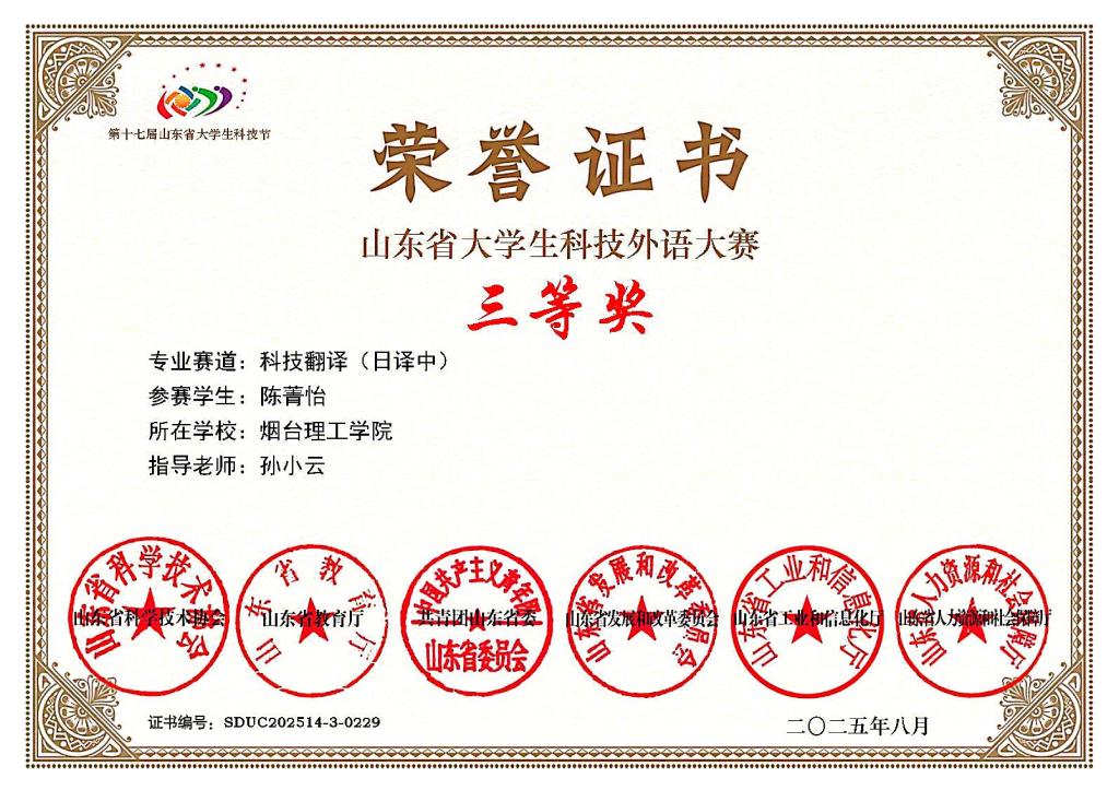 陈菁怡,太阳成集团tyc234cc2023级日语专业员工,现任外2303-1班团支书。曾获得2024年太阳成集团tyc234cc琴心之辩辩论赛冠军;2023--2024学年中被评选为“”优秀共青团干部”;“外研社-国才杯”理解当代中国全国老员工外语能力大赛校级铜奖;日本语能力测试N2证书;2023-2024“社会公益先进个人”;烟台理工学2023-2024学年祥隆奖学金;2023-2024学年,荣获太阳成集团tyc234cc“优秀员工标兵”荣誉称号;全国高校商业精英挑战赛国际贸易竞赛“敏学杯”山东省总决赛二等奖;获得2025年太阳成集团tyc234cc琴心之辩辩论赛“亚军”;太阳成集团tyc234cc团总支 2024年度共青团优秀共青团干部荣誉称号;全国高校商业精英挑战赛文旅与会展创新创业实践竞赛山东省总决赛中荣获二等奖;山东省老员工科技外语大赛科技翻译(日译中)三等奖;山东省老员工科技外语大赛科技翻译(中译日)三等奖;“外研社-国才杯”理解当代中国全国老员工外语能力大赛校级铜奖;全国高校商业精英挑战赛创新创业竞赛营销模拟决策赛道山东省级总决赛二等奖;2024-2025学年获得太阳成集团tyc234cc“优秀员工标荣誉称号”。
