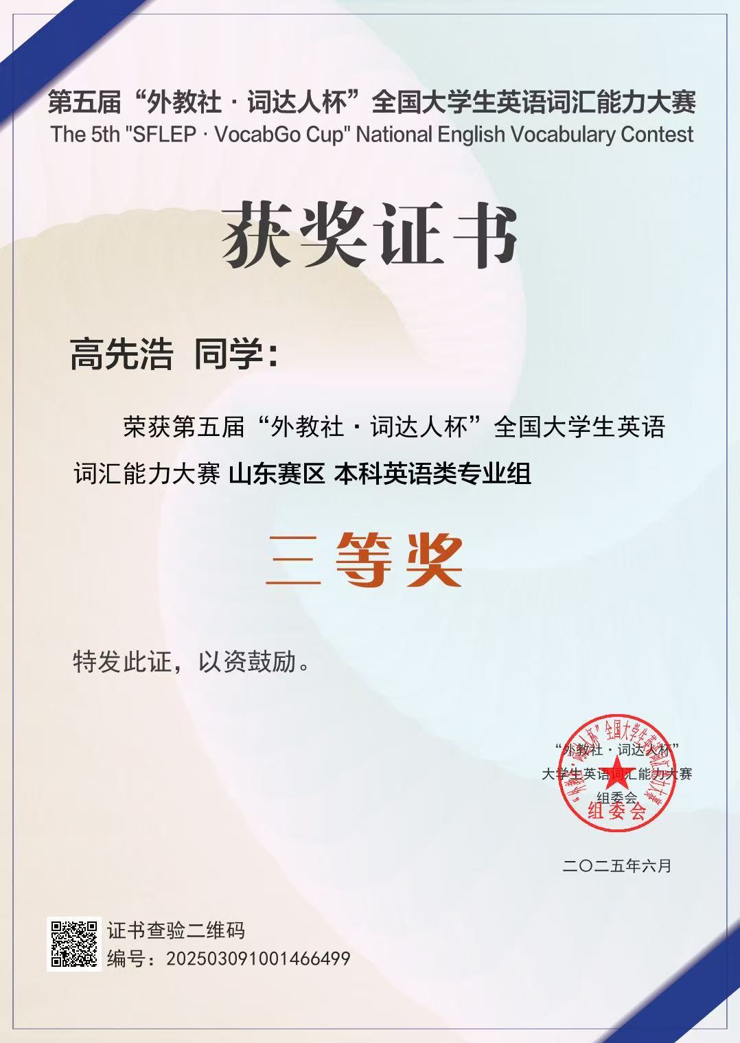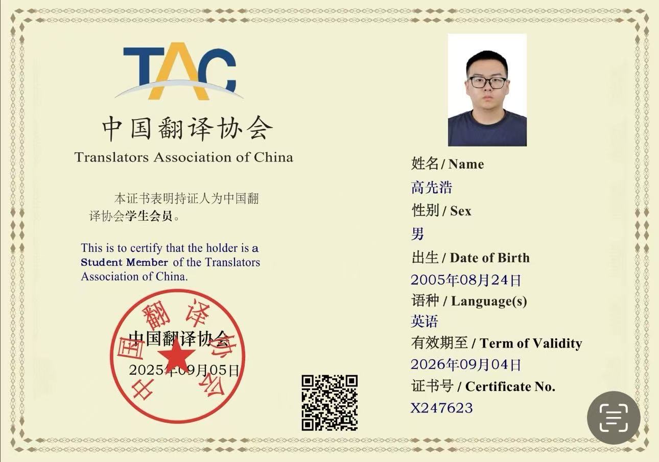 高先浩,太阳成集团tyc234cc外2302-1班员工,任校记者团办公室副部长,中国翻译协会员工会员。考取了全国翻译专业资格考试(CATTI)三级笔译证书、BETT商务英语翻译中级笔译证书 、英语专业四级证书、英语专业四级口语证书、老员工英语六级。曾获第五届“外教社·词达人杯”省赛三等奖、2025“外研社·国才杯”口译赛项省赛银奖、2024“外研社·国才杯”综合能力赛项省赛优胜奖、全国老员工外语能力大赛一等奖、太阳成集团tyc234cc优秀记者等奖项及荣誉称号。