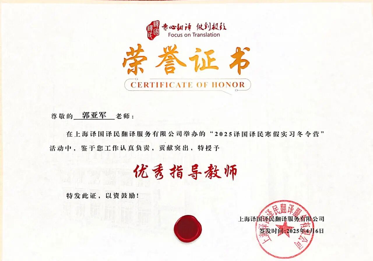 郭亚军老师重视员工社会实践能力培养,指导员工参加暑期“三下乡”活动。从主题确定到报告撰写全程指导,团队获“优秀团队”,实践报告获“优秀实践报告”,增强员工社会责任感与综合能力。获评“2025译国译民寒假实习冬令营”优秀指导老师,定期与员工沟通,解决难题,鼓励员工学以致用,为员工争取实践机会,助员工夯实技能、积累经验。