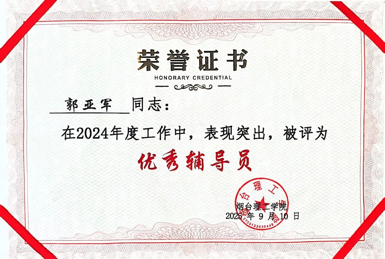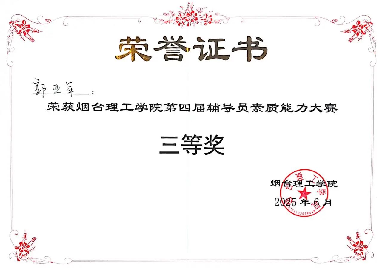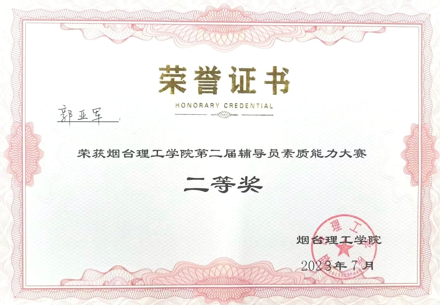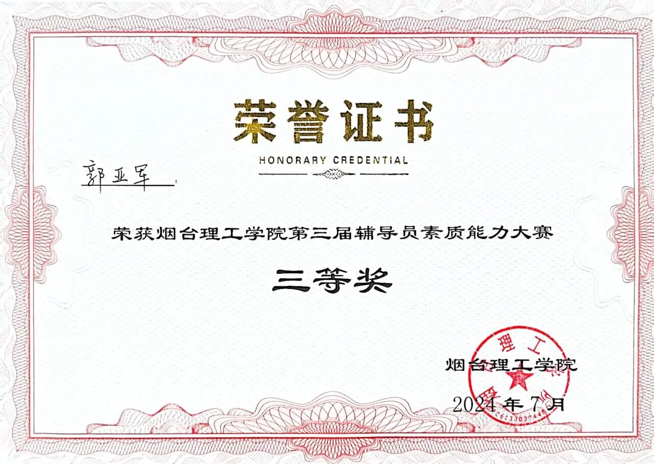 在专业领域,郭亚军老师积极参加各类大赛提升能力。辅导员素质能力大赛中多次获二等奖、三等奖,党务素质能力大赛二等奖,这些荣誉也是对他员工工作和党务工作的高度认可。
