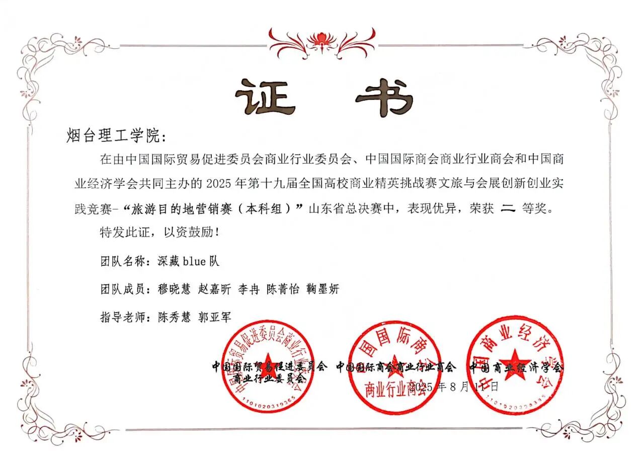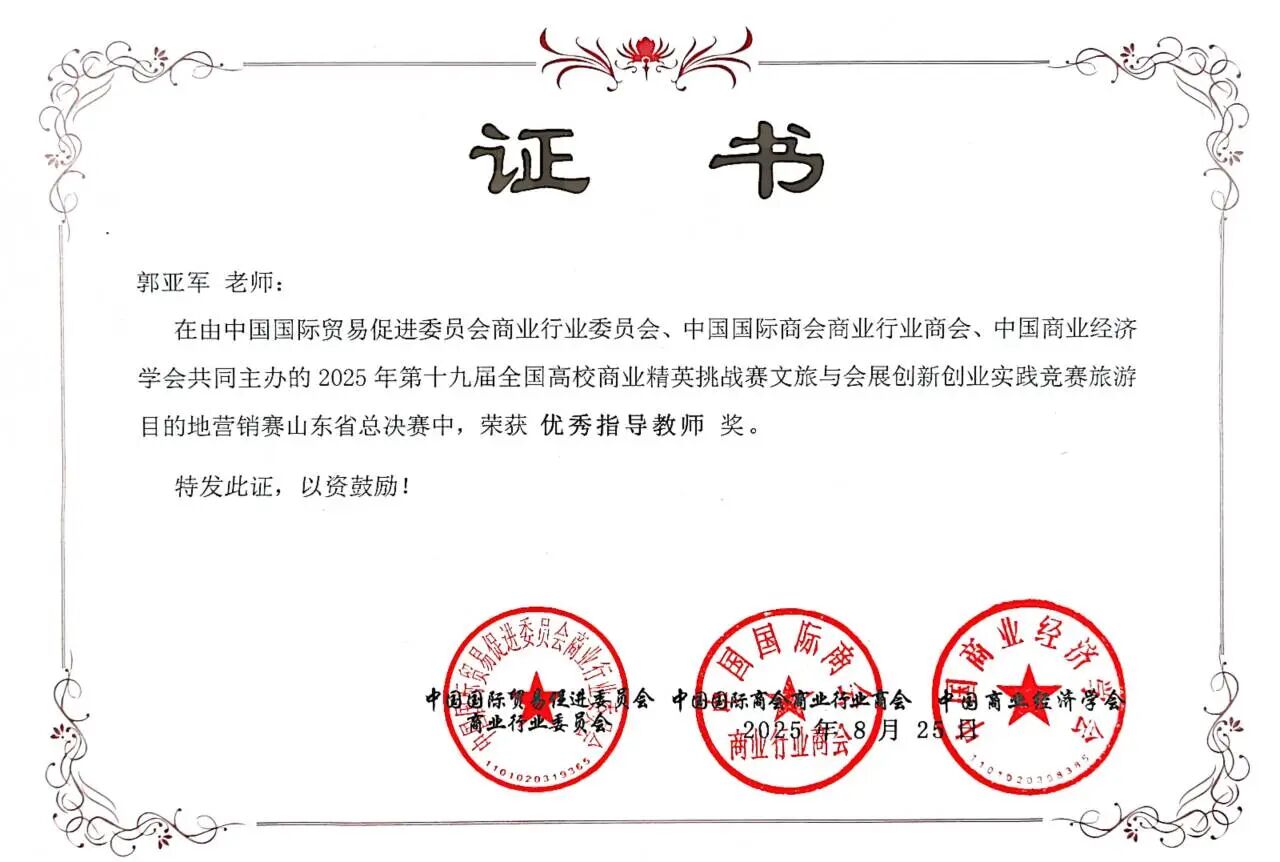 鼓励员工参加创新创业竞赛,带领团队参加2025年全国高校商业精英挑战赛文旅与发展创新创业实践竞赛。从选题到策划,团队获山东省总决赛二等奖,获“优秀指导老师”,培养员工创新思维与团队协作精神。