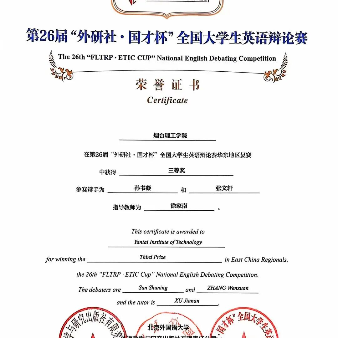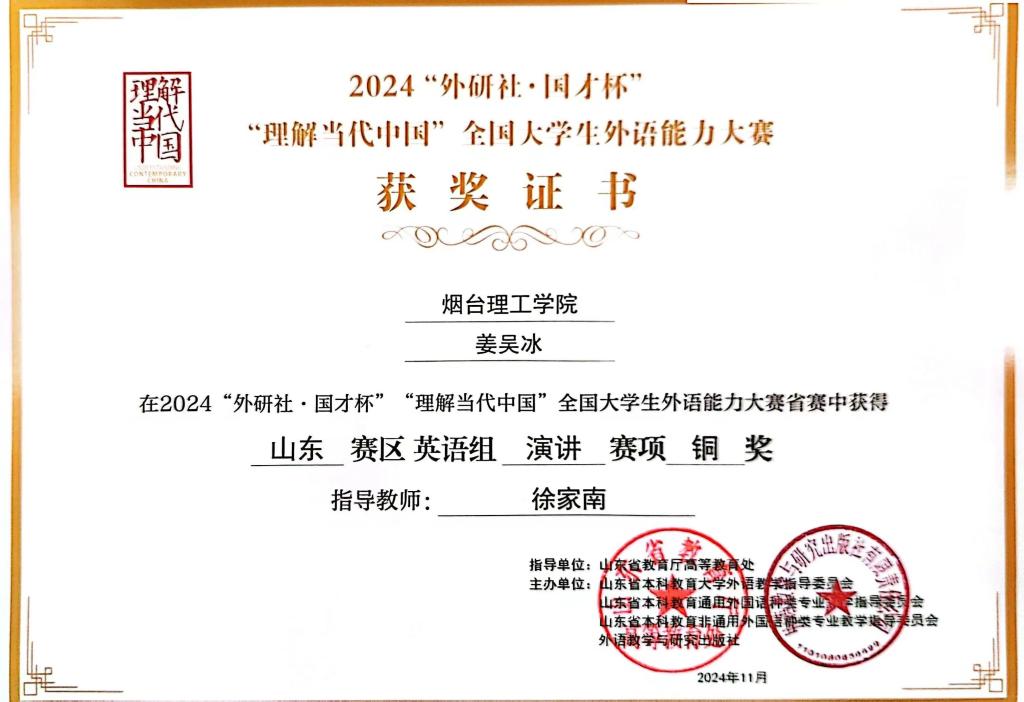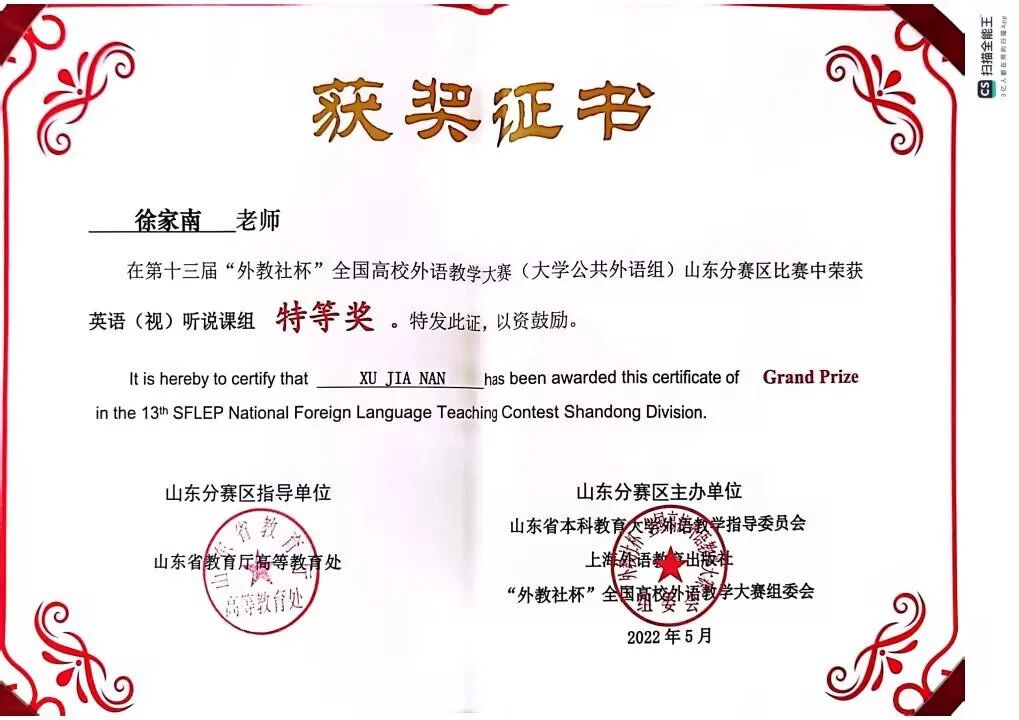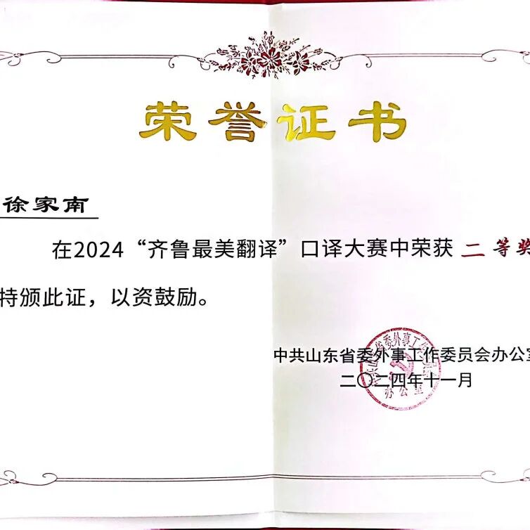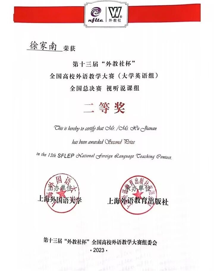 徐家南老师为中共党员,英语专业副教授,系主任,烟台市翻译协会理事,烟台市外语协会副秘书长,2020年毕业于浙江大学,获翻译硕士专业学位,浙江大学国际精英组织人才培养计划荣誉学员。全国翻译资格证书一级笔译、二级口译证书持有者。参与各级教科研项目6项。主讲《基础英语》、《高级英语视听说》、《英语语音语调基础与训练》等课程,曾荣获山东省青教赛一等奖、“21世纪杯全国青年英语演讲比赛”全国总决赛亚军、第十三届“外教社杯”全国高校外语教学大赛“视听说组”山东省特等奖、全国二等奖、“齐鲁最美翻译”口译大赛二等奖。多次指导员工在演讲、辩论、口译比赛中获得国家级、省级奖励。主持山东省艺术科学重点课题一项。