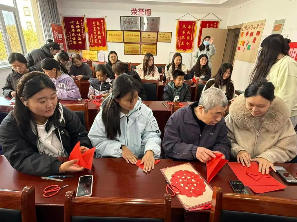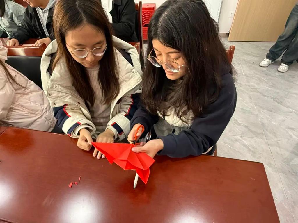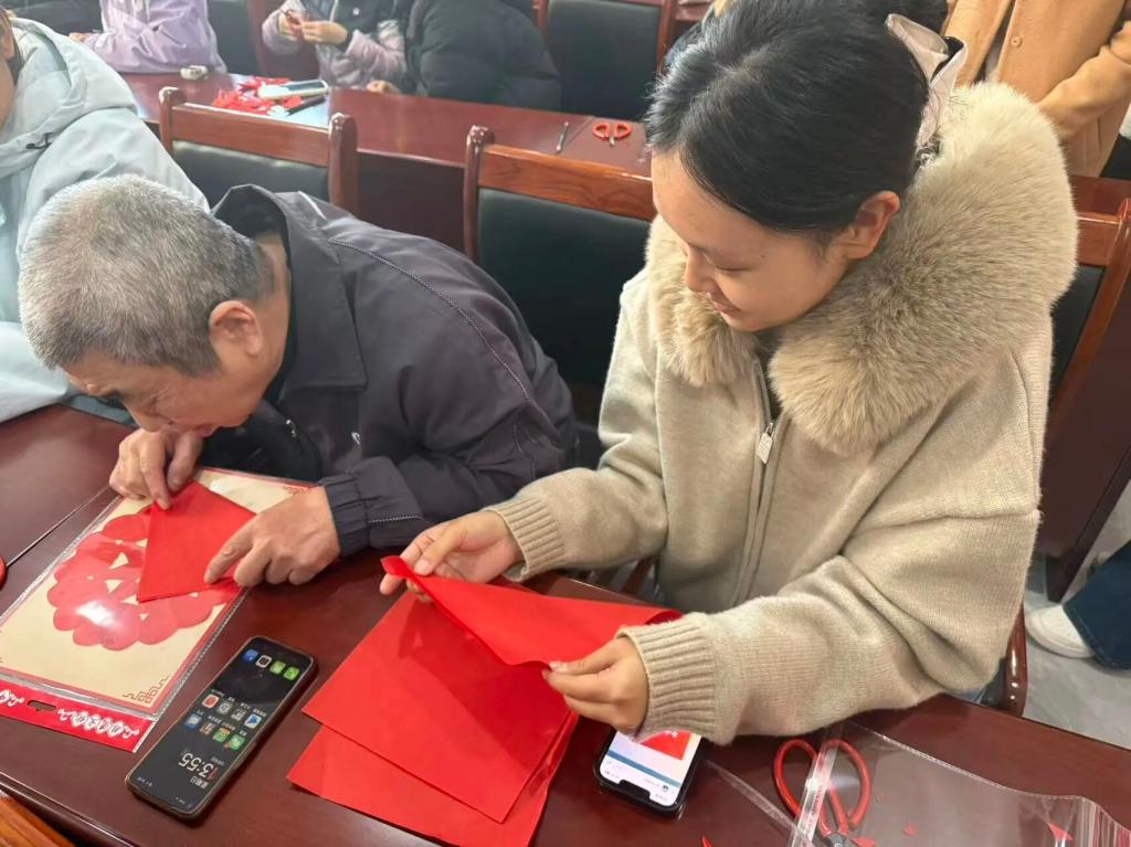 活动现场暖意融融:同学们先为老人们分发红纸、剪刀、刻刀等工具,随后用通俗易懂的语言讲解剪纸的基本常识,包括对折、起剪、收尾的关键步骤,并结合实例介绍了“年年有余”“松鹤延年”等吉祥图案的文化内涵。实操环节中,同学们分组指导,根据老人动手能力调整教学节奏,手把手演示镂空、曲线剪等技巧;老人们相互探讨,时而向同学们请教,专注裁剪着心仪的图案。活动最后,大家展示作品、交流创作心得,同学们还为作品贴上标签,方便老人珍藏。