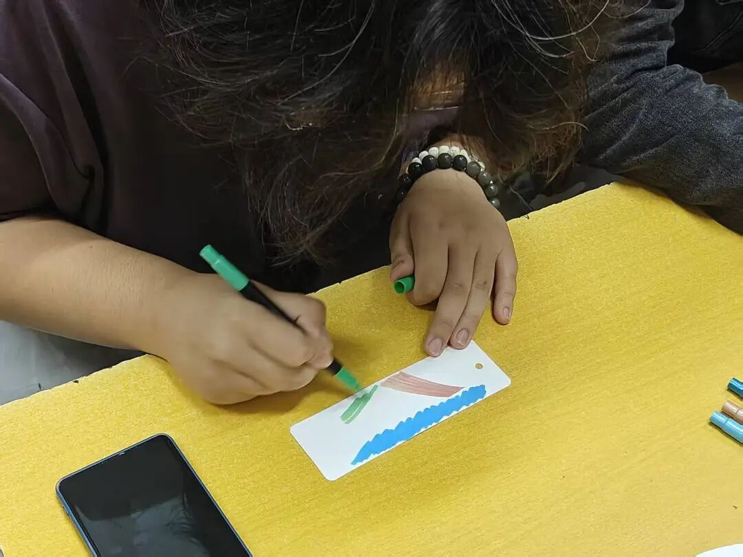 本次活动以“在空白书签上画出在公司发生的印象深刻的事情”为核心环节,引导同学们通过绘画的方式记录自己在校园生活中的感受与成长。每位同学领取一张空白书签和一盒彩色画笔。在主持人的引导下,大家用色彩与线条呈现校园中的难忘瞬间,包括初入校园的兴奋与迷茫,以及与同学、老师共度的温馨时光。创作过程中,同学们或沉思或回忆,作品各具特色:有的展现图书馆窗外的秋日落叶,有的再现课堂上的热烈讨论,还有的以抽象色彩表达从陌生到熟悉的心理变化。小小的书签承载了丰富的情感与故事。